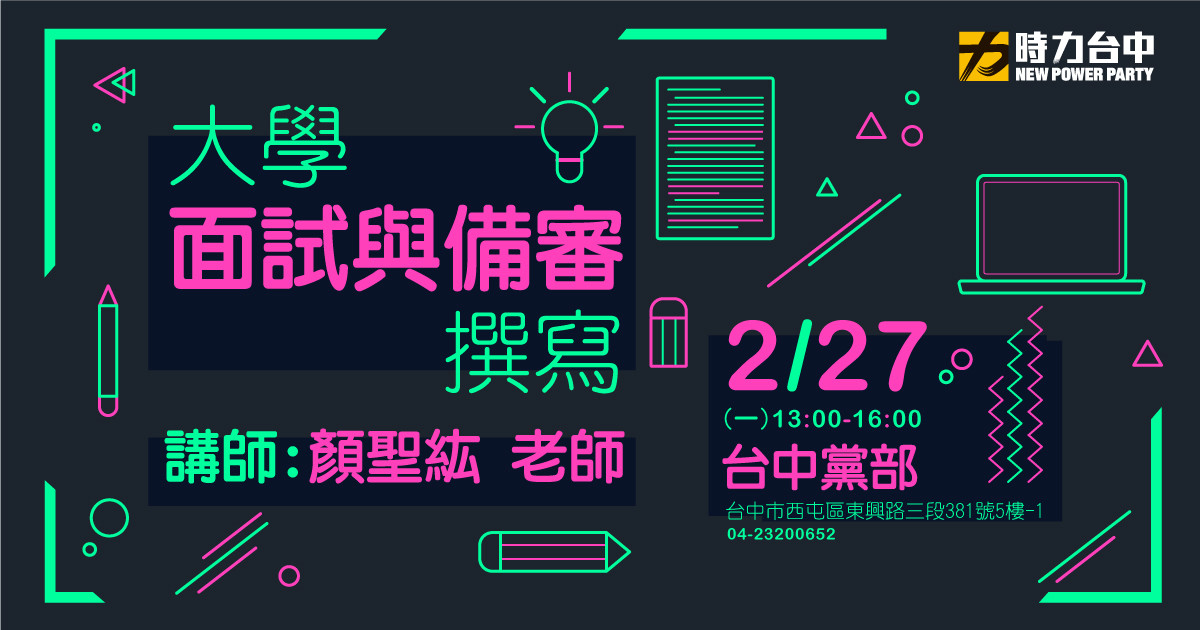 時代力量台中黨部,邀請顏聖紘老師(國立中山大學生物科學系副教授、鳴人堂專欄作家),為台中家長學子,提供新世代的大學申請建議。